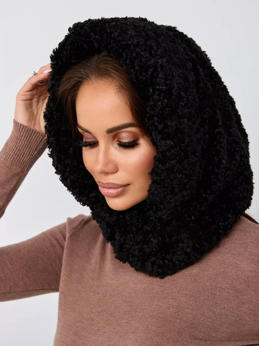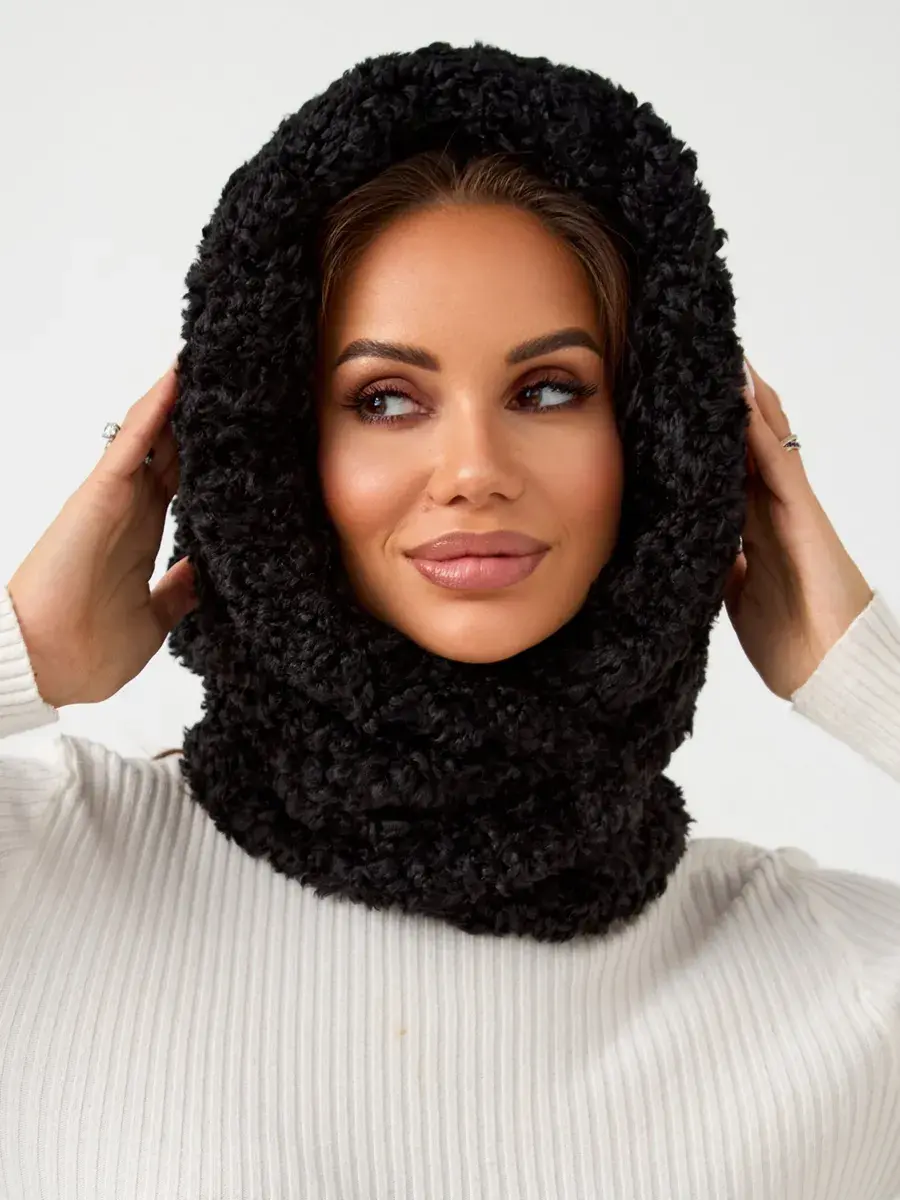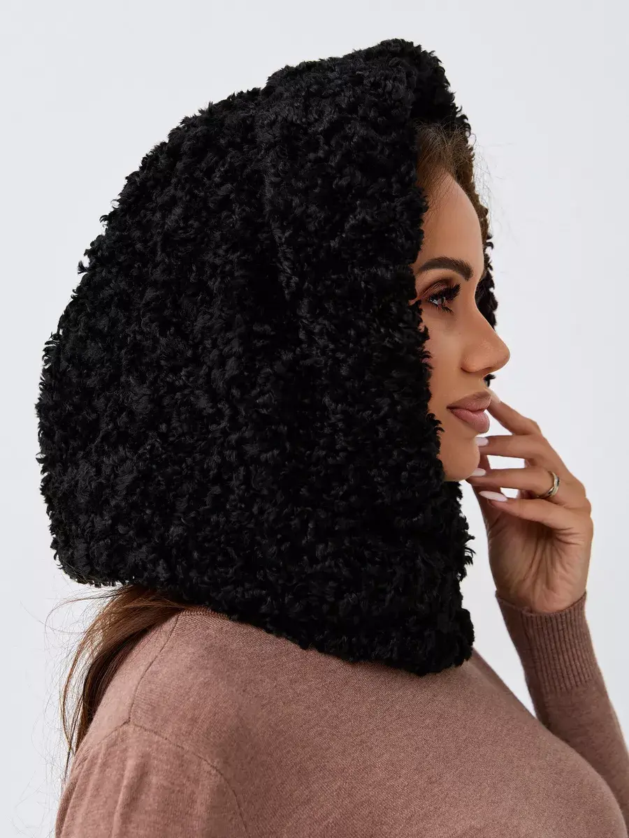 Демисезонный характер изделия делает его идеальным как для осенних прогулок, так и для зимних морозов. Теплый кудрявый платок с хлястиком на кнопках обеспечивает надежную фиксацию на голове. Натуральная шерсть придает роскошный вид этому аксессуару. Вязаная пряжа с эффектом мягкого меха тедди гарантирует долговечность без деформации.