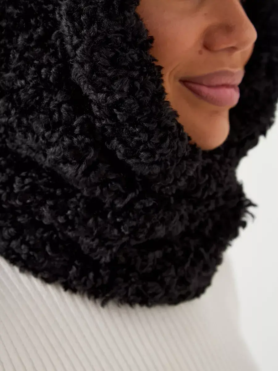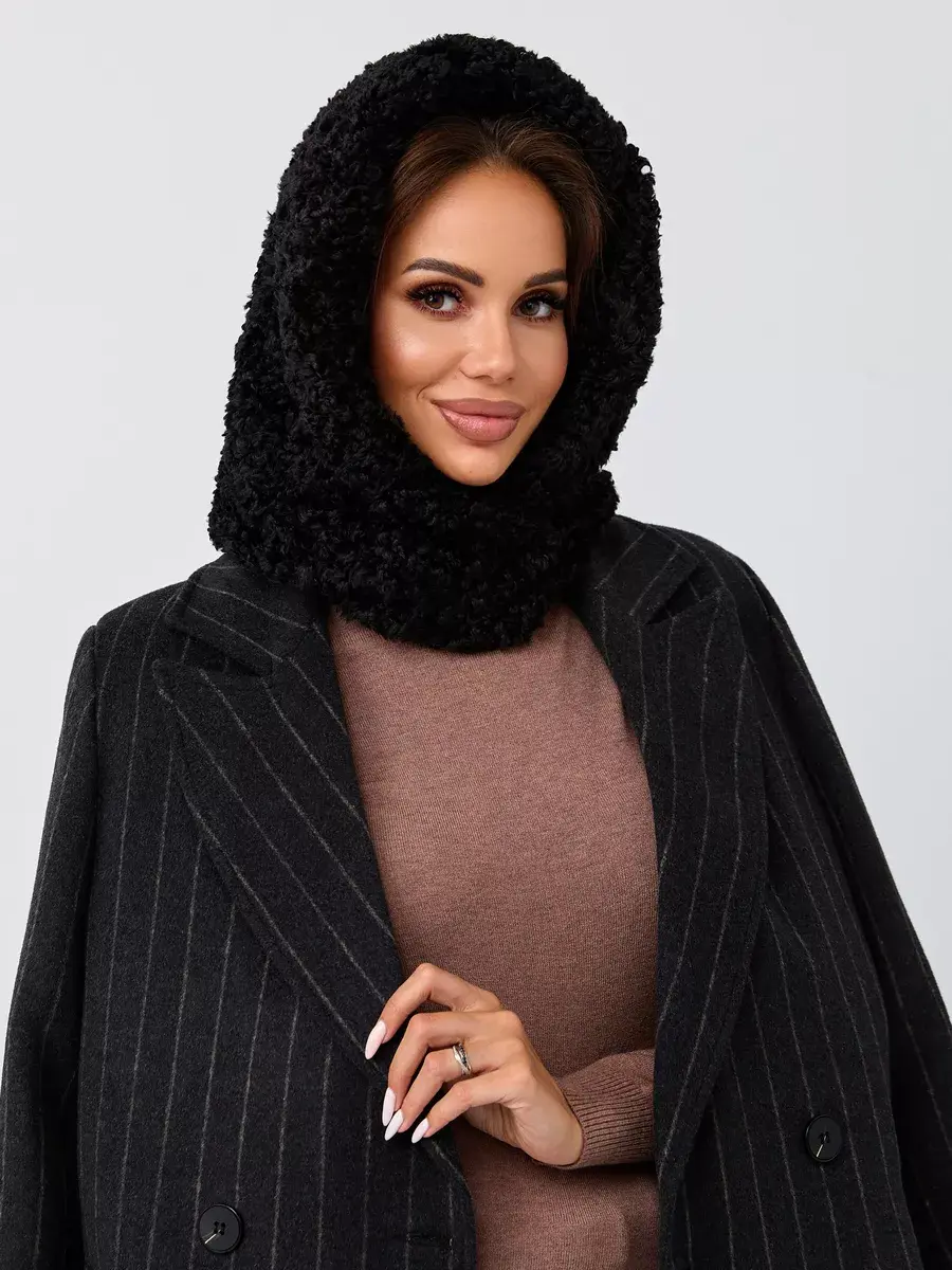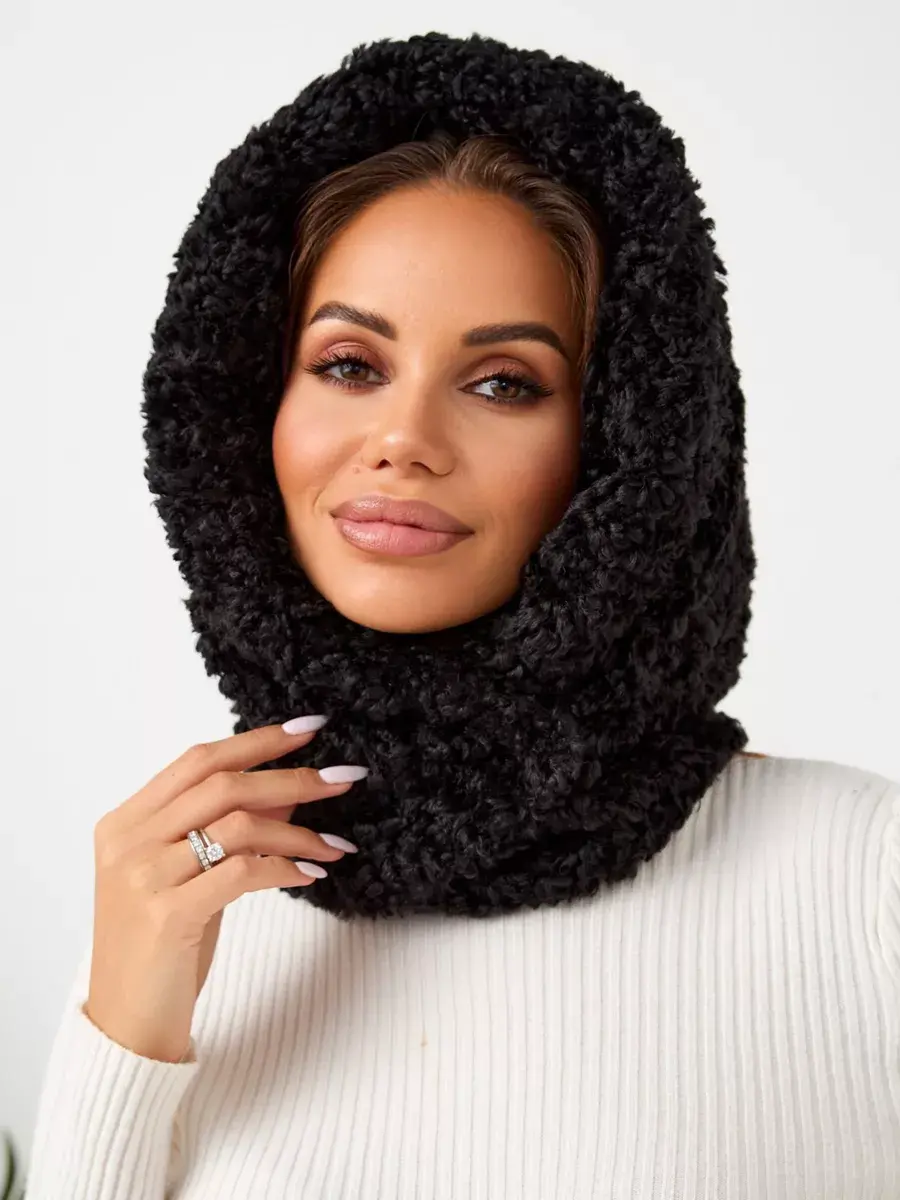 Демисезонный характер изделия делает его идеальным как для осенних прогулок, так и для зимних морозов. Теплый кудрявый платок с хлястиком на кнопках обеспечивает надежную фиксацию на голове. Натуральная шерсть придает роскошный вид этому аксессуару. Вязаная пряжа с эффектом мягкого меха тедди гарантирует долговечность без деформации.